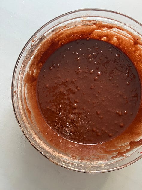 Agrega el aceite y el chocolate oscuro derretido.