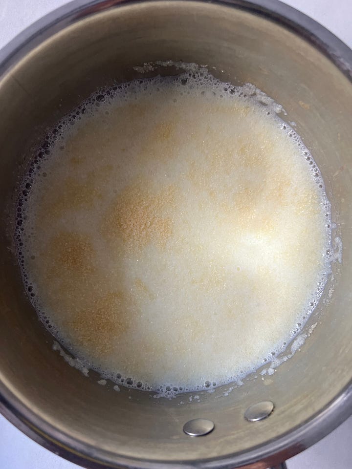 Lleva la mezcla a fuego bajo batiendo constantemente hasta que la gelatina se disuelva por completo, añade el azúcar y mezcla hasta que se disuelva.