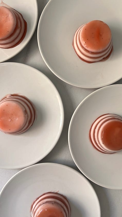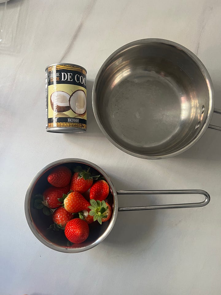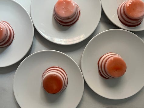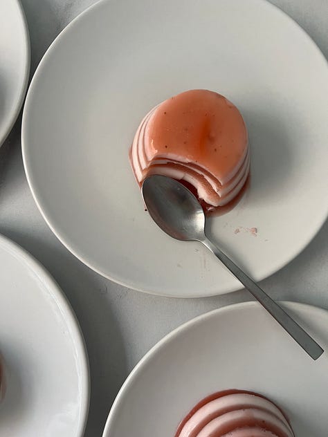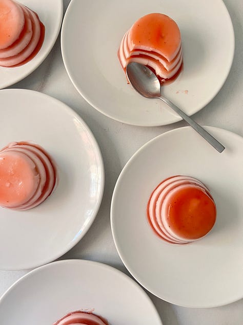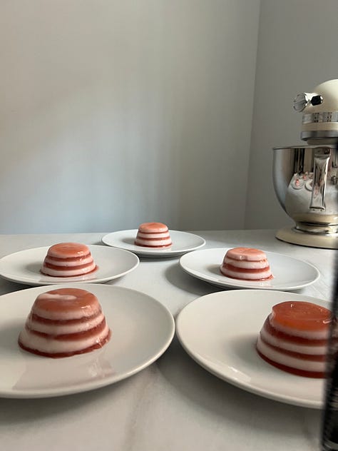 Vierte primero una capa de panna cotta de coco y deja cuajar ligeramente, luego agrega la gelatina de fresa y así sucesivamente.