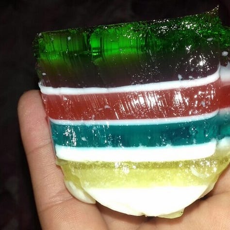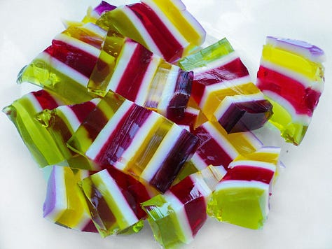 Las mesas llenas de colores exagerados, las gelatinas de muchos colores combinada con leche condensada, patrones.